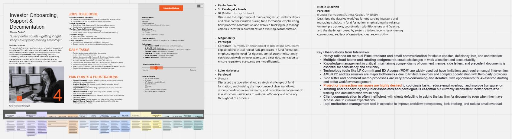 At Simpson Thacher, I led UX research initiatives focused on understanding and improving the complex fund formation process within a large-scale legal environment. My role centered on uncovering how legal professionals—from partners to associates and support staff—navigate highly specialized workflows involving regulatory requirements, document creation, and client services. I conducted in-depth interviews and contextual walkthroughs with attorneys and legal operations staff to map the current-state workflows, capturing task sequences, decision points, document types, systems accessed, and time-billed activities. This research provided visibility into inefficiencies, redundancies, and pain points across a process that spans multiple teams, tools, and handoffs. Insights were synthesized into user personas, end-to-end journey maps, and micro-journeys that detailed critical moments within fund formation, including document preparation, review cycles, approvals, and client interactions. These artifacts helped stakeholders clearly understand the operational complexity and variability across roles.